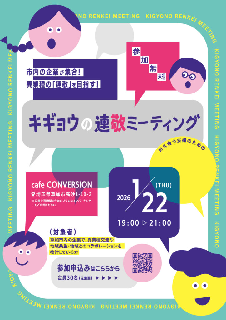 専門職同士の対話から始まった第一回目に続き、第二回目は**「キギョウの連敬ミーティング」**として開催しました。草加市内で地域共生や地域とのコラボレーションを考えている・興味がある企業を中心にお集まりいただき、企業と福祉が「連敬」し合う可能性について本音で語り合いました。