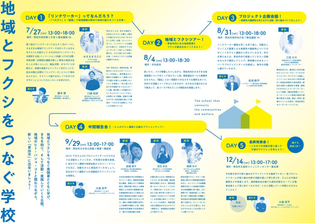地域と福祉をつなぐ人が、草加のまちの中に少しずつ増えていく。そんな景色が、この学校から静かに広がり始めています。2023年度のふくフクフェスで見えた「参加者がプレイヤーになっていく」という流れが、この学校という形でさらに深化し、継続的な実践へとつながっていく基盤が生まれました。
