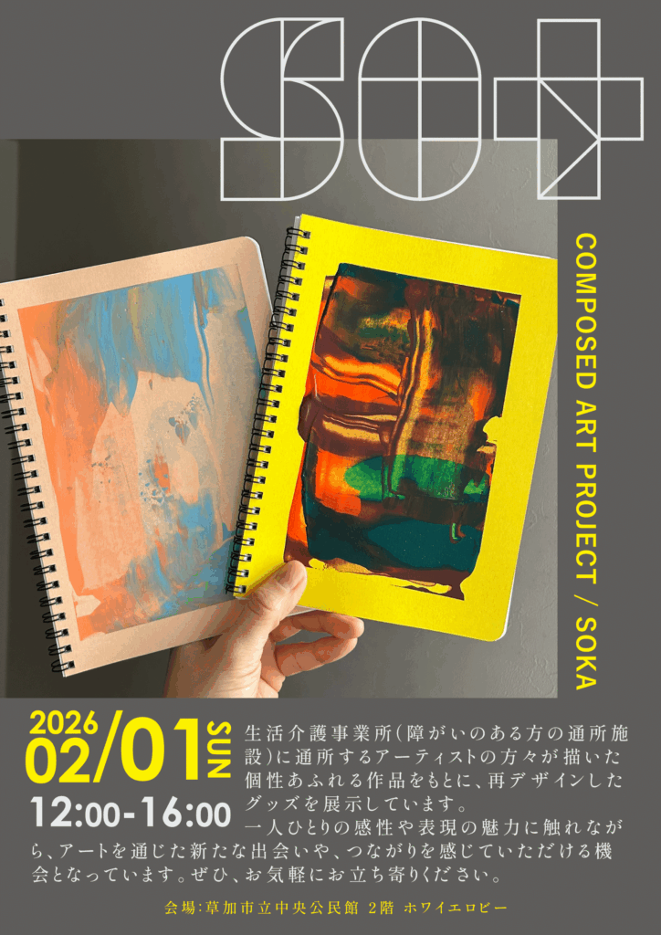 **2026年2月1日(日)12:00-16:00には、草加市立中央公民館2階ホワイエロビーにて展示会を開催。**一人ひとりの感性や表現の魅力に触れながら、アートを通じた新たな出会いやつながりを感じていただける機会となりました。