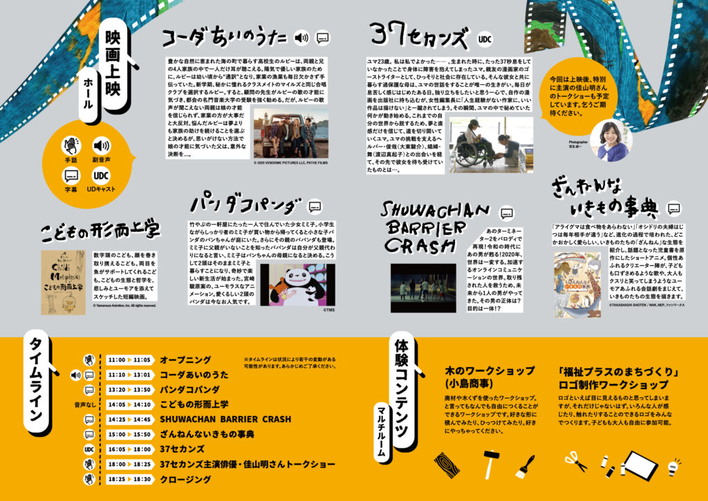 福祉プラスのまちづくり事業の第二回目は、その「当たり前」に優しく問いかける映画祭でした。その名も**『ふくフク映画祭』**。「声をあげてしまうから映画に参加できない」「じっとしていられないから映画館には行けない」そんな想いを抱いていた方々にも、思いっきり映画を楽しんでいただける場所を目指しました。