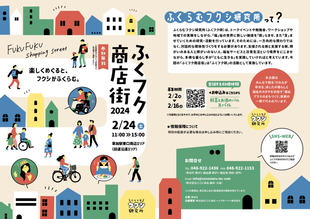 この企画の名前は、「ふくらむフクシ研究所(略して、ふくフク研)」から生まれました。ふくフク研は、埼玉県草加市発のプロジェクトとして、トークイベントや映画祭、お店ごっこなど地域での様々な実験を重ねながら、「福」祉の世界に新しい価値を「膨」らませ、また「含」ませていくための研究・活動を行っています。