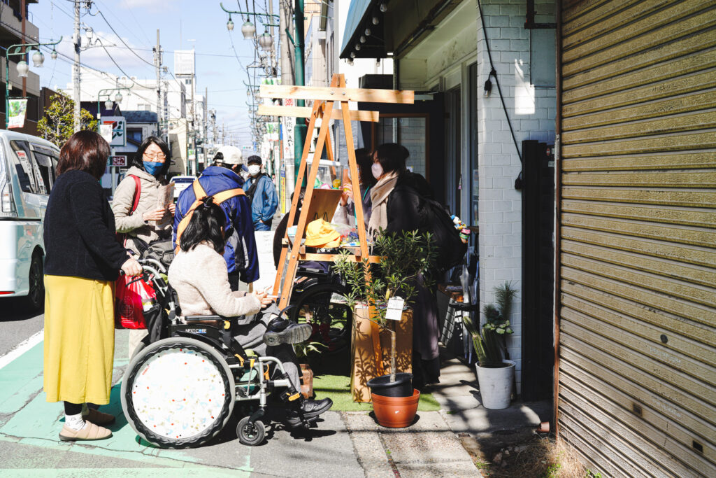 お店の一角に福祉事業所でつくられた商品を自然に並べてみたり、休憩場所の椅子を車椅子にして、車椅子を利用する方が商店街を当たり前のように行き来する景色をつくったり。