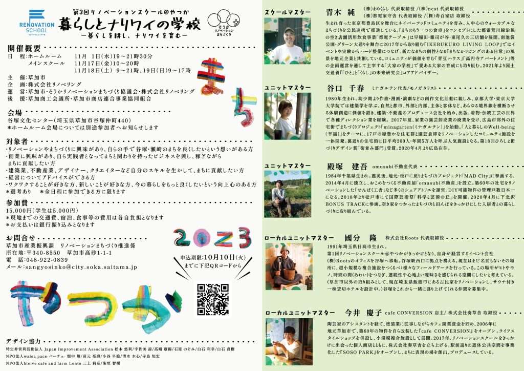 第三回リノベーションスクール@やつか 2023.09.13GRAPHIC, PRODUCT, 福祉事業 草加市産業振興課受注デザイン。谷塚で行われるリノベーションスクールのパンフ。裏面には『みんな』と作った文字を配置。 Tweet Share Pin it GRAPHIC, PRODUCT, 福祉事業 デザイン, 福祉, 草加 まちの学校VOL.25 福祉プラスのまちづくり事業vol.1トークライブ 関連記事一覧 第4回ほぼスカイツリーコンソーシアム大会「暮らしから医療... 生活介護事業所工賃向上プロジェクト SO+ Next Stage様 草加市谷塚の塾ホームページ+パン... まちの学校VOL.24 FLAT LOCATION2024 まちの学校VOL.25 叶え合う支援事業vol.2キギョウの連敬ミーティング ふくフク相談室in草加2024 おばけ屋しきを作ってみよう2024