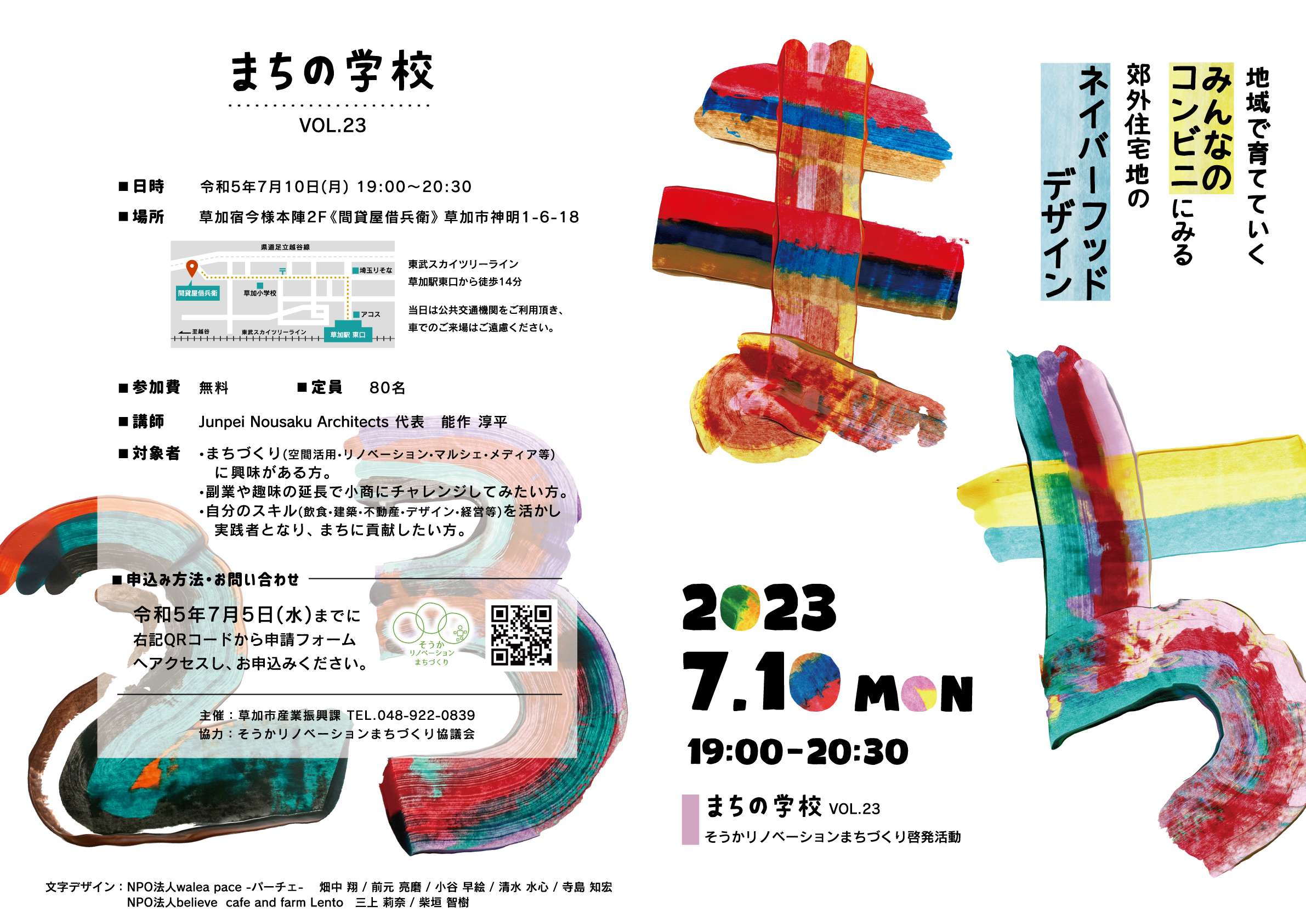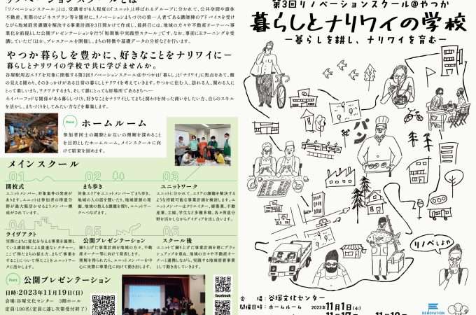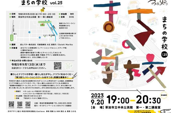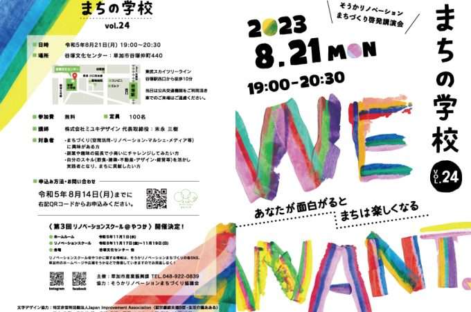 草加市産業振興課受注デザイン。谷塚で行われるリノベーションスクールのパンフ。裏面には『みんな』と作った文字を配置。