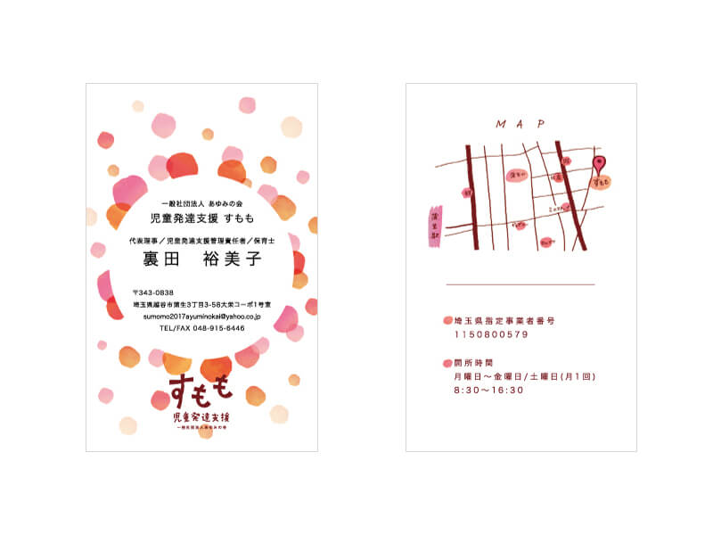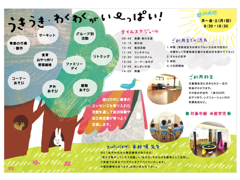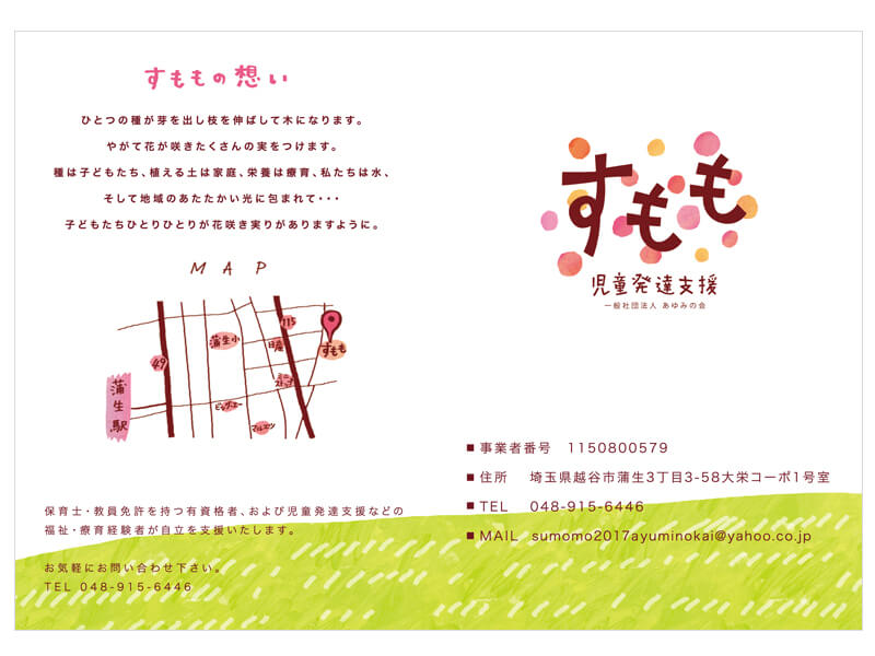 一般社団法人 あゆみの会 児童発達支援 すもも様 2018.09.26GRAPHIC, PRODUCT 一般社団法人 あゆみの会 児童発達支援 すもも様のパンフレット・名刺・カーステッカーを作成させて頂きました。 手にとっていただけやすいよう、こどもにも親しみやすい可愛く優しいイメージでイラストを作成し、デザインを行いました。 Client 一般社団法人 あゆみの会 児童発達支援 すもも様 Release 2018年9月 Tweet Share Pin it GRAPHIC, PRODUCT 児童発達支援すもも様 関連記事一覧 福祉プラスのまちづくり事業vol.3トークライブ2 ふくフクスナック 叶え合う支援事業vol.3チイキの連敬ミーティング SOKA SKY LANTAN※草加市初開催 叶え合う支援事業vol.2キギョウの連敬ミーティング まちの学校VOL.25 ふくフク運動会2024 ふくフクキャンプ2025 ミーツザご近所vol.2